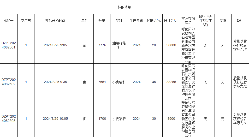 轉(zhuǎn)讓標(biāo)的為油菜籽秸稈、小麥秸稈、小麥秸稈,涉及面積油菜籽秸稈7776畝、小麥秸稈7651畝、小麥秸稈1700畝,意向受讓方在競買前應(yīng)自行對標(biāo)的預(yù)估數(shù)量和質(zhì)量情況進行充分了解,交易標(biāo)的均以實際狀況為準(zhǔn)。標(biāo)的存放地位于呼倫貝爾農(nóng)墾物資石油集團有限公司新巴爾虎左旗鑫輝騰河農(nóng)業(yè)種植有限公司,詳情見標(biāo)的清單: