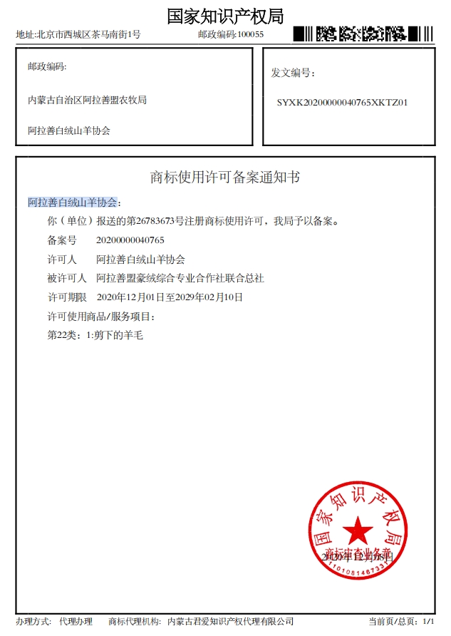 阿拉善白絨山羊協(xié)會已收到國家知識產(chǎn)權(quán)局下發(fā)的4項商標(biāo)使用許可備案通知書