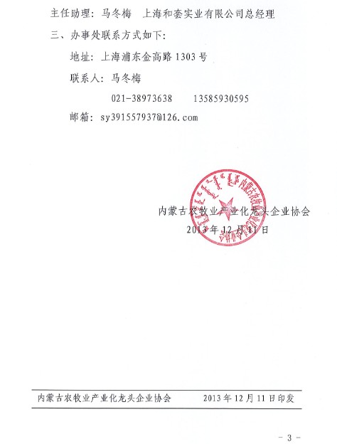 關(guān)于內(nèi)蒙古農(nóng)牧業(yè)產(chǎn)業(yè)化龍頭企業(yè)協(xié)會(huì)成立上海辦事處的通知