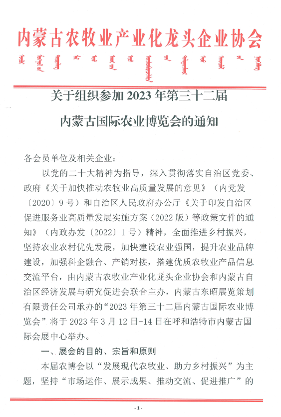 關(guān)于組織參加2023年第三十二屆內(nèi)蒙古國際農(nóng)業(yè)博覽會的通知