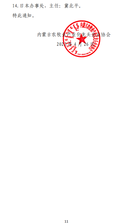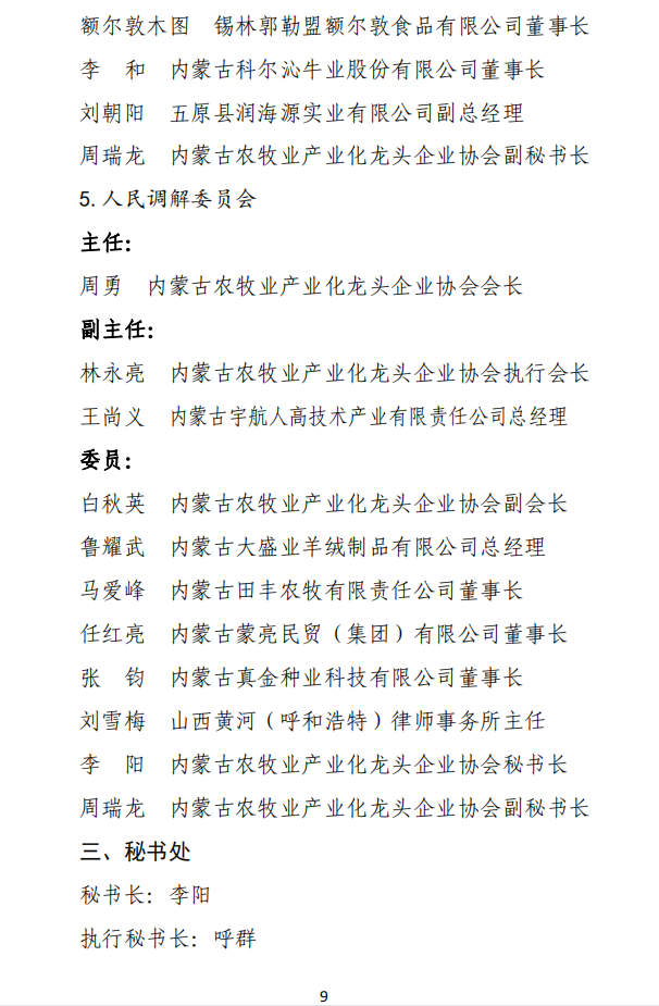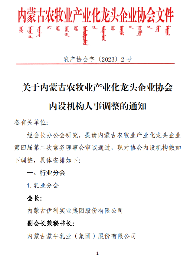 關于內蒙古農牧業(yè)產業(yè)化龍頭企業(yè)協(xié)會內設機構人事調整的通知